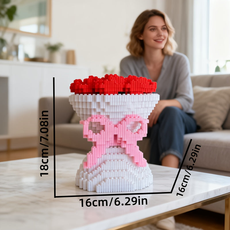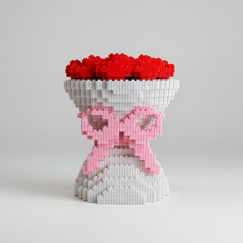 Dit bos rozen is een elegant en compact bouwpakket dat perfect past op een tafel, kast of bureau. De witte vaas met roze strik en de rode rozen maken het een echte blikvanger, terwijl het bouwen zorgt voor een rustig en prettig bouwmoment. Ideaal als decoratie of als origineel cadeau.