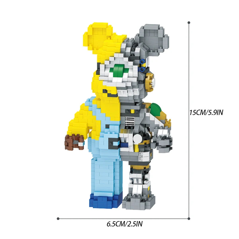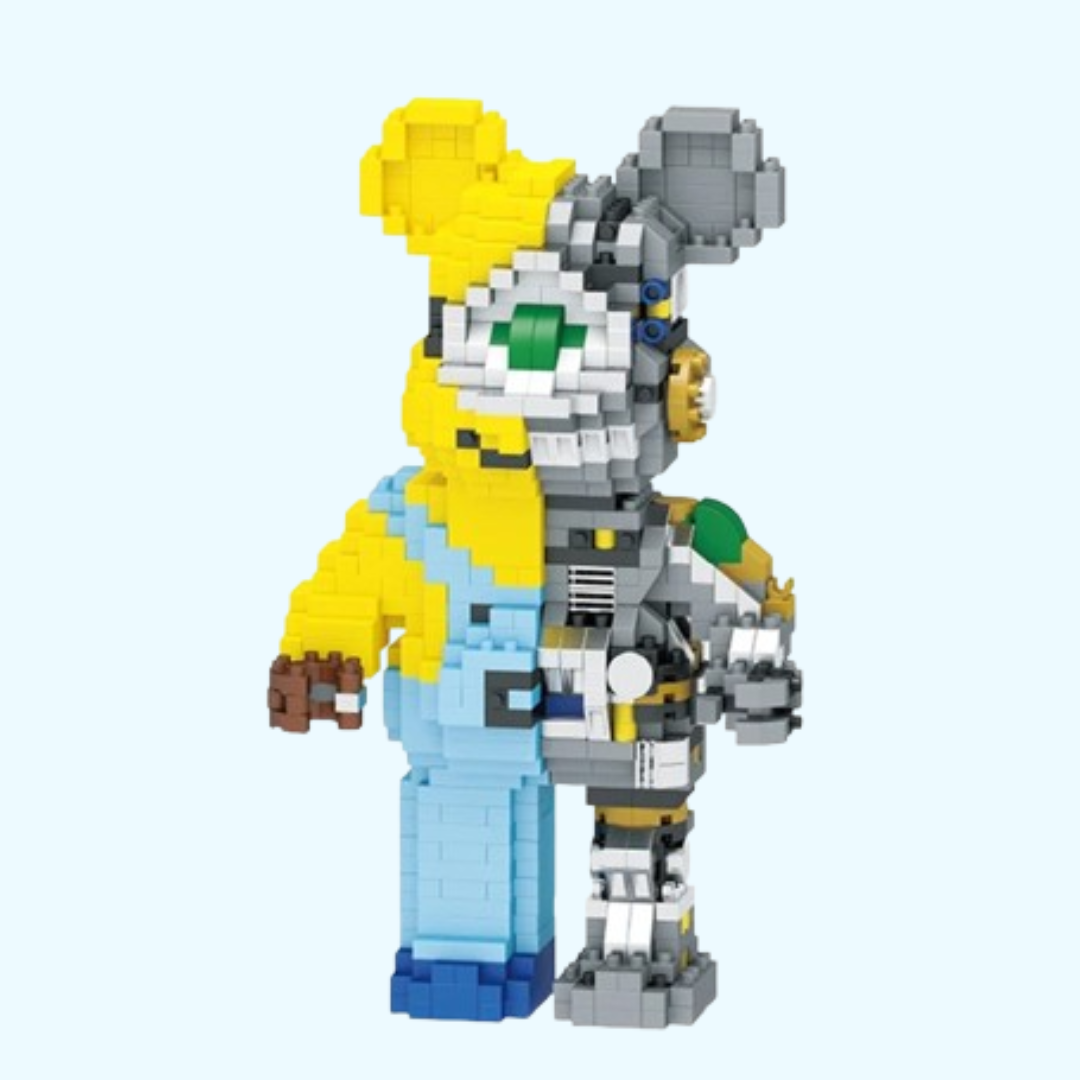 Een uniek bouwpakket dat twee werelden samenbrengt: links een vrolijk wezen, rechts een indrukwekkende robot. Perfect voor iedereen die van opvallende creaties houdt.