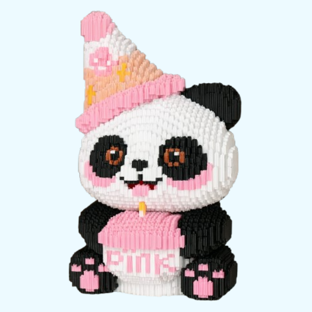Met zijn roze verjaardagsmuts en taart is deze panda klaar om te vieren! Een vrolijk bouwproject dat perfect is als cadeau of om zelf een feestelijke sfeer in huis te halen.