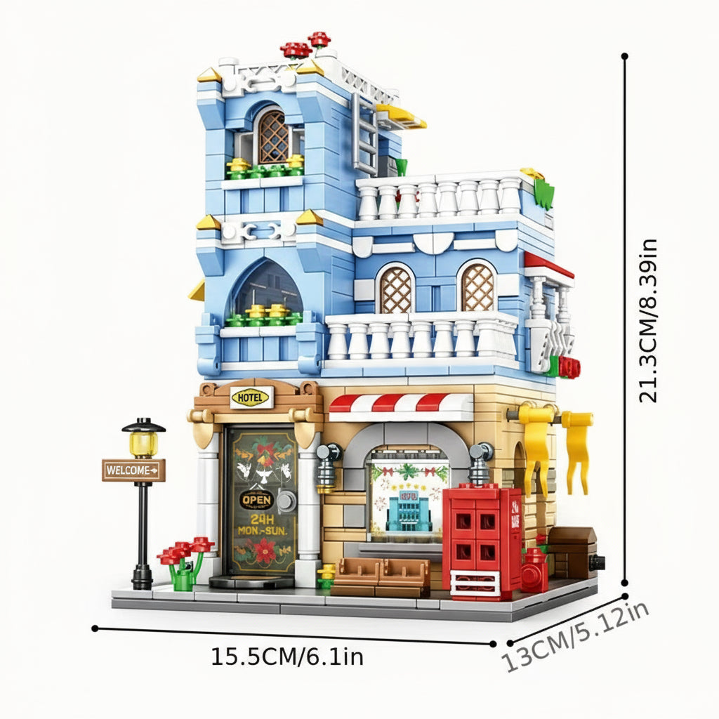 Creëer dit sfeervolle motel vol details: met balkon, bloemen en zelfs een mini telefooncel. Een perfect project voor iedereen die houdt van ontspannen bouwen en unieke displaystukken.