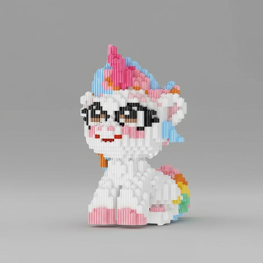 Dit bouwpakket bestaat uit veel stukjes waarmee jij de Zittende eenhoorn helemaal kan namaken. De Zittende eenhoorn is 35cm lang.